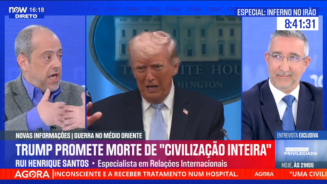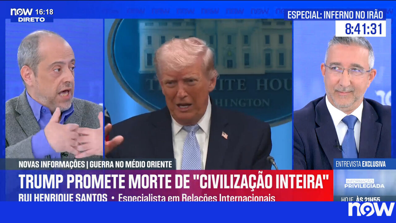 O especialista em Relações Internacionais Rui Henriques Santos disse, esta terça-feira, no NOW, que a promessa do Presidente norte-americano de matar uma "civilização inteira" no Irão é «de um grau de chalupice retórica que não se encontra em nenhum outro líder dos Estados Unidos». Já o professor Luís Bernardino refere que Donald Trump «não pensaria que [a guerra] durasse tanto tempo», tendo duvidado da «resistência do Irão».