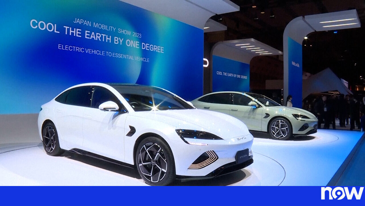 Imagens mostram veículos elétricos da Tesla e modelos da fabricante chinesa BYD lado a lado, refletindo a crescente presença da BYD no mercado global de carros elétricos. A comparação visual aponta para a evolução da concorrência no setor automóvel elétrico.