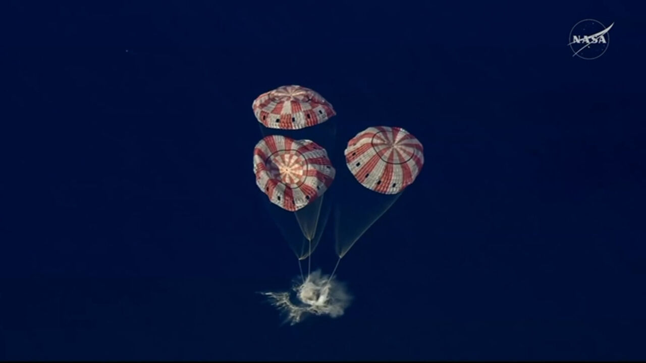 Para auxiliar a descida da cápsula 'Orion', foram acionados quase uma dúzia de paraquedas.