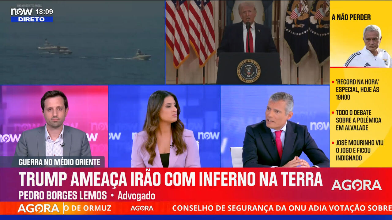 O advogado Pedro Borges Lemos e o economista Filipe Grilo debatem no NOW as implicações do ultimato de Donald Trump ao Irão e o bloqueio do Estreito de Ormuz. Pedro Borges Lemos afirma categoricamente que, «embora o Irão possa eventualmente perder militarmente esta guerra, sob o ponto de vista político, já a ganhou», destacando a capacidade de Teerão em ditar as regras de navegação internacional ao selecionar que navios podem atravessar o estreito.