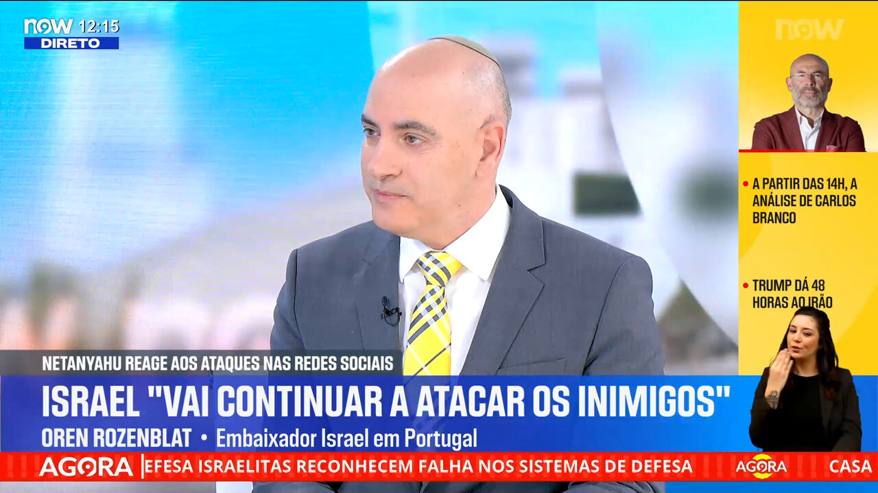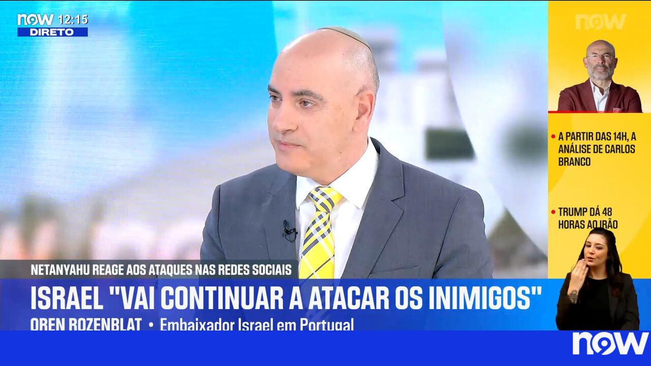 O embaixador de Israel em Portugal, Oren Rozenblatt, afirmou no NOW que os ataques iranianos visam exclusivamente civis israelitas, enquanto Israel e os Estados Unidos atingem apenas alvos militares ou do regime iraniano. O embaixador revelou que o chefe do Estado-Maior israelita estima que o conflito durará mais três semanas, estando atualmente a meio da operação militar. Relativamente aos objetivos de Israel, Rozenblatt indicou três prioridades: eliminar as armas nucleares do Irão e a capacidade de as produzir, destruir as instalações de mísseis balísticos e criar condições para que o povo iraniano possa mudar o regime.
