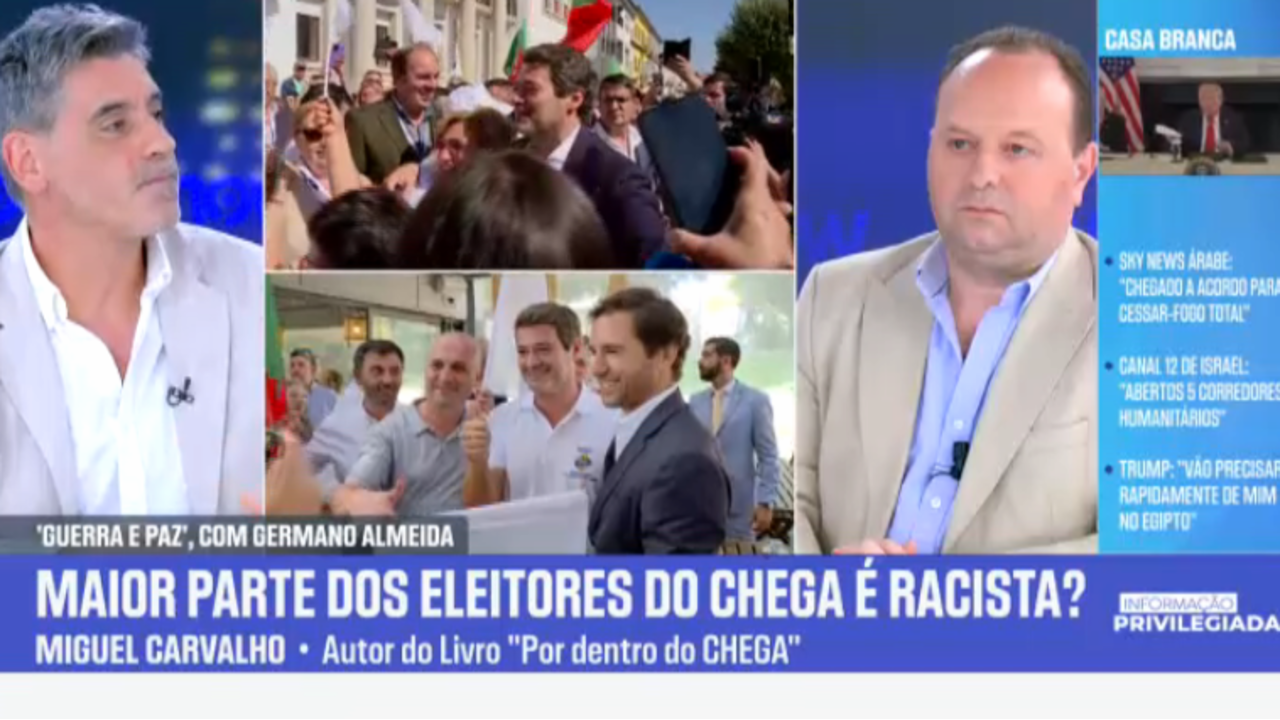 O programa de Germano Almeida, que ontem contou com o jornalista Miguel Carvalho, autor do livro "Por Dentro do Chega", como convidado especial e Eduarda Pires como pivô, obteve um share médio de 2.3%, bem acima dos 2.1% e 70.195 espectadores da CNN Portugal e dos 1.7% e 55.904 da SIC Notícias.