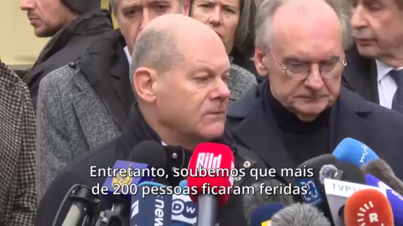 "Soubemos que mais de 200 pessoas ficaram feridas. Um número inacreditável de quase 40 pessoas estão gravemente feridas, pelo que se trata de um acontecimento terrível e trágico e todos nós estamos solidários com as famílias", disse inicialmente Olaf Scholz.