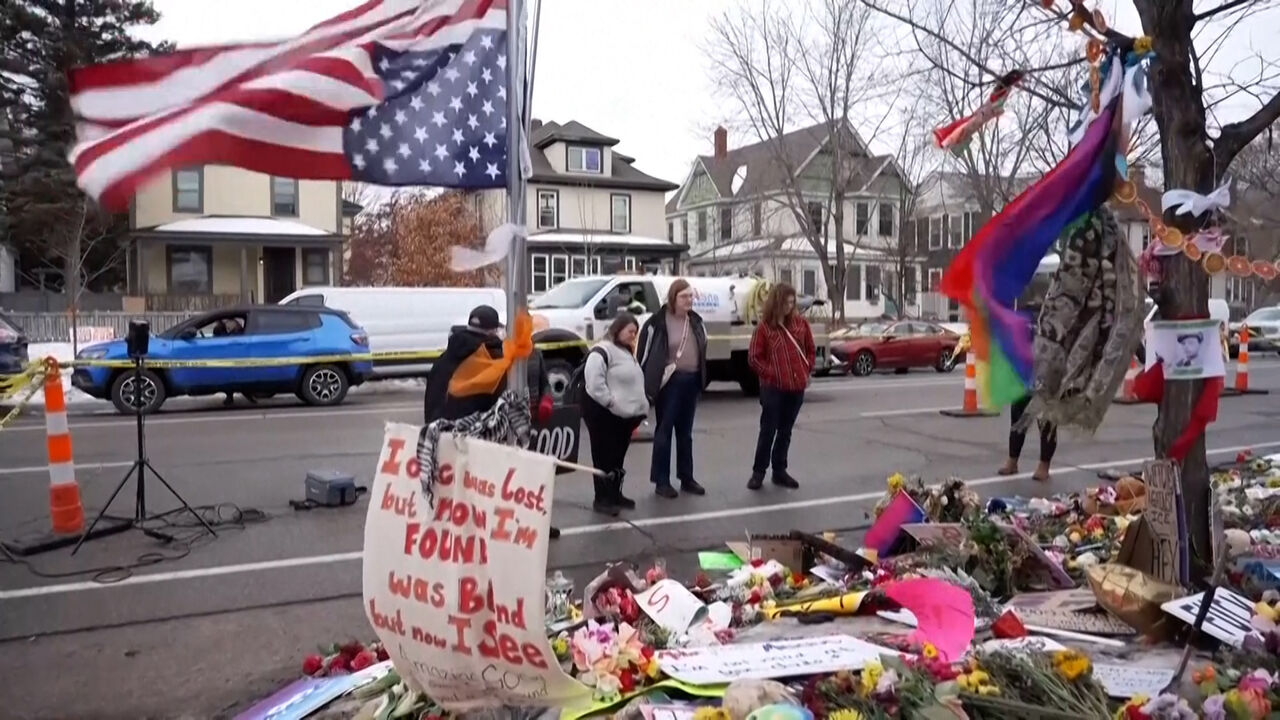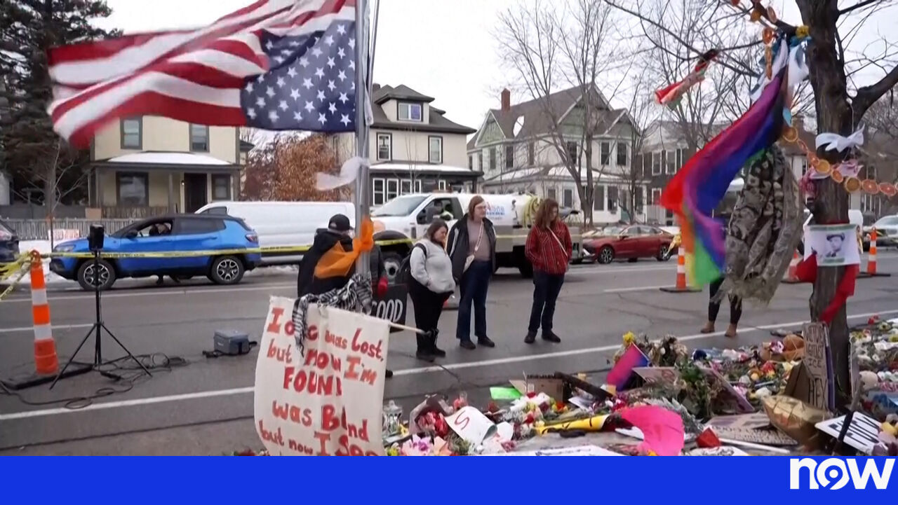Flores, cartazes e velas foram colocados num memorial improvisado perto do local onde Renee Good foi morta a tiro por um agente do ICE, a 7 de janeiro, em Minneapolis.
