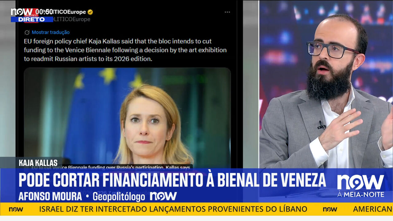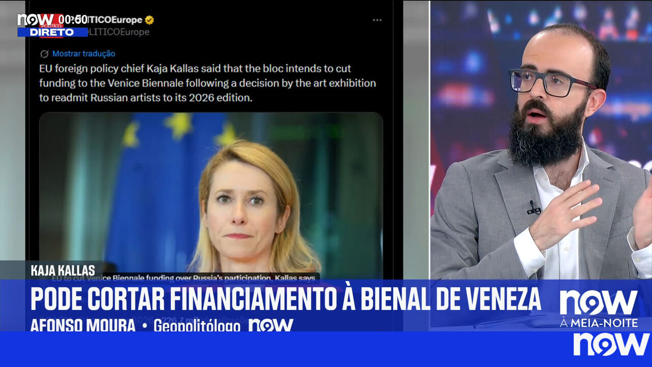 O geopolitólogo Afonso Moura analisou no NOW as tensões geopolíticas e o financiamento da União Europeia. O especialista criticou a postura de Bruxelas em relação à Bienal de Veneza e à exclusão de artistas russos, afirmando que «a arte deve transcender isto tudo». Afonso Moura sublinhou ainda a realidade financeira do bloco europeu, lembrando que «a União Europeia não tem dinheiro. O dinheiro que a União Europeia tem é o dinheiro que os Estados soberanos lhe dão».